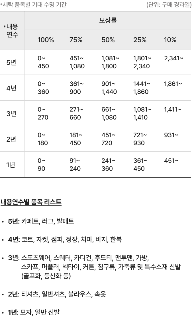 - 일반 서비스의 경우 보상비율 및 내용연수 외의 세부사항은 공정거래위원회 고시(2020-16호)를 준용합니다.